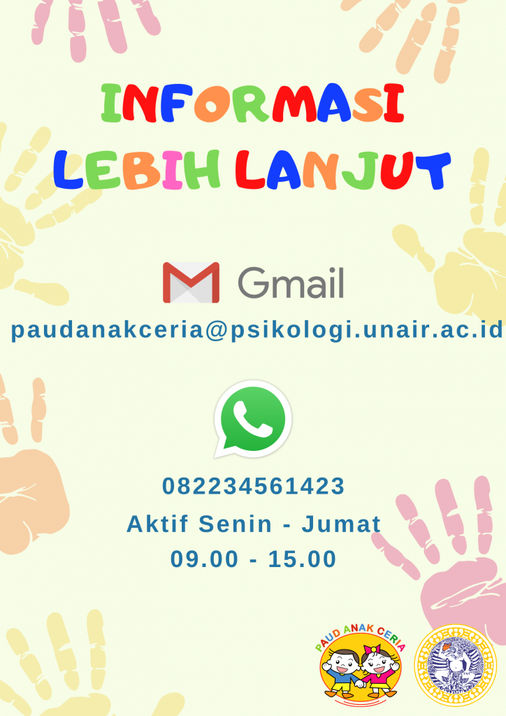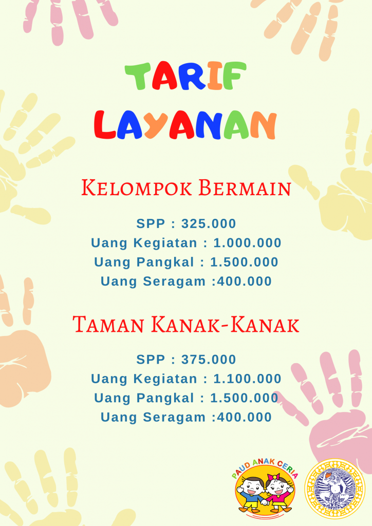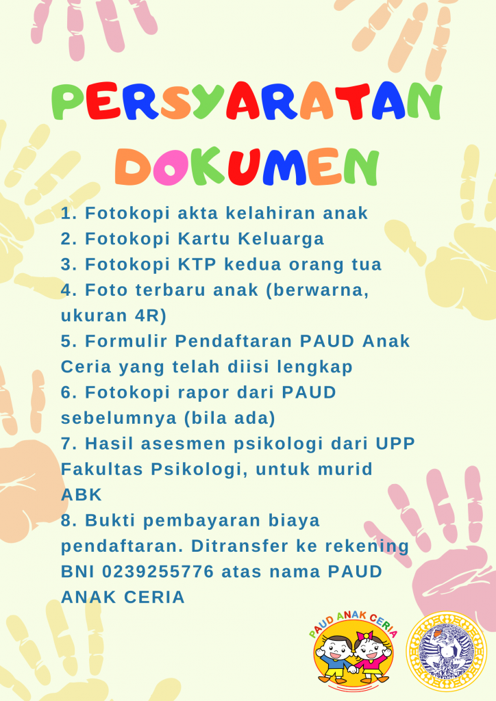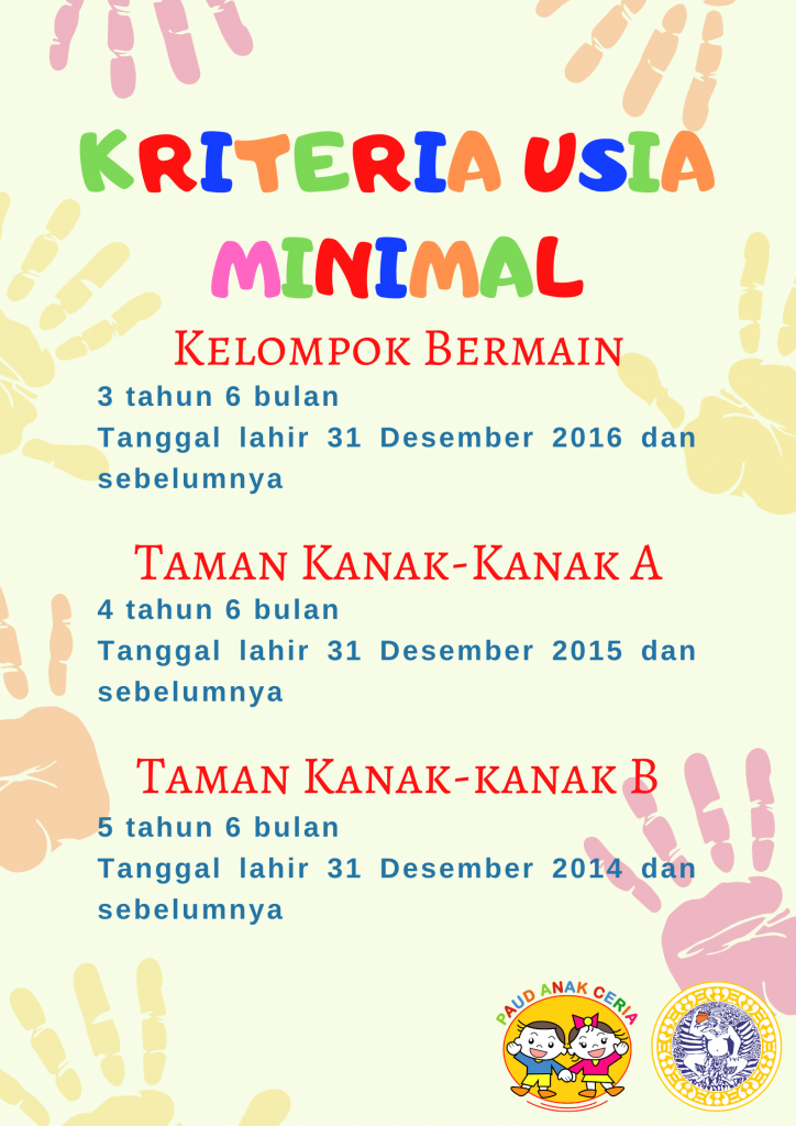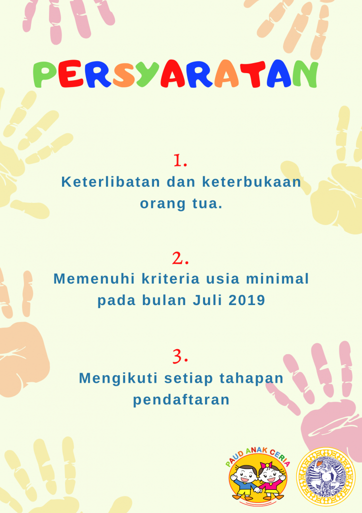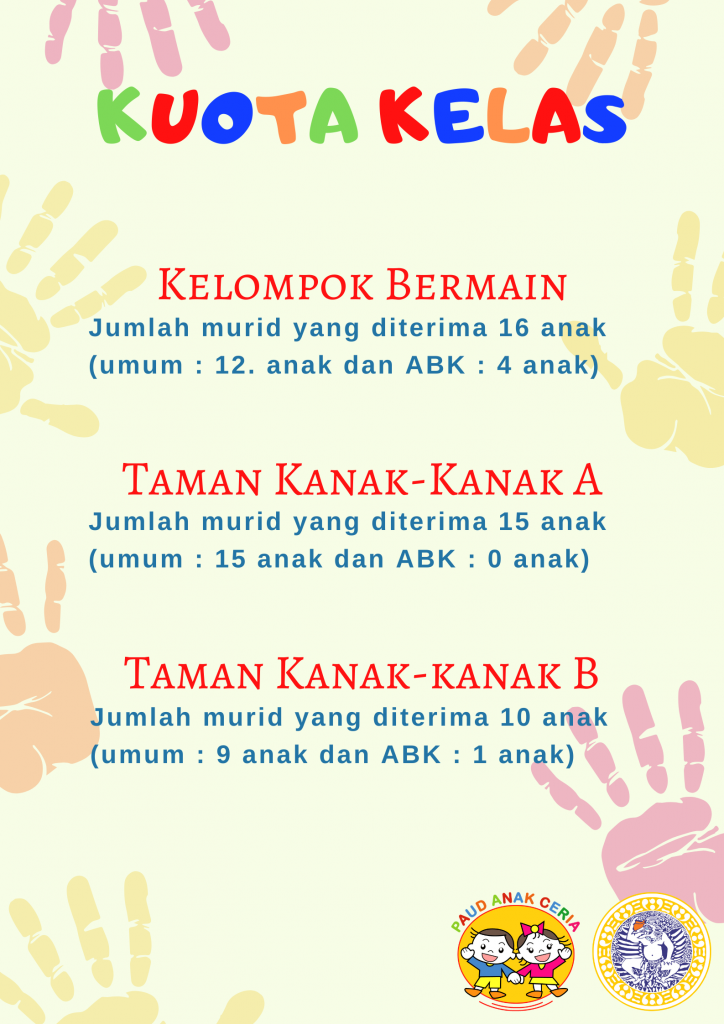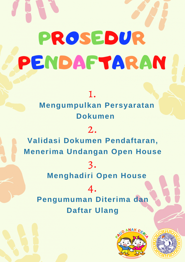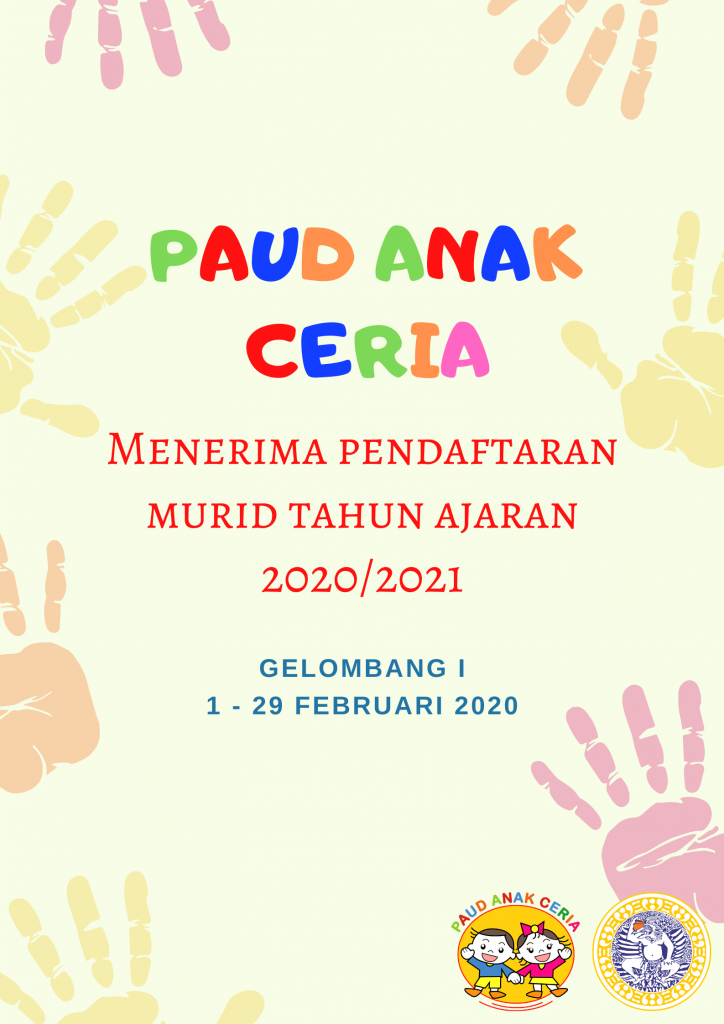 Penerimaan Murid Baru Tahun Ajaran 2020-2021by February 4, 2020September 13, 2020 Informasi Lengkap dan Formulir PMB dapat diunduh dengan klik tautan di bawah ini. INFO PMB PAUD ANAK CERIA 2020-2021Download Formulir PMB Anak CeriaDownload Related posts: Penerimaan Murid Baru Tahun Ajaran 2020-2021 Gelombang II INFORMASI PENERIMAAN MURID BARU (PMB) PENERIMAAN MURID BARU TAHUN AJARAN 2022-2023