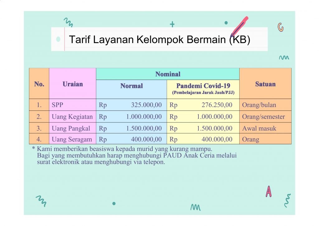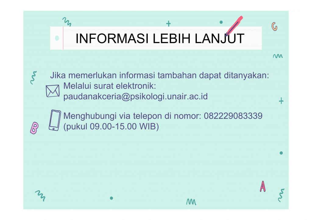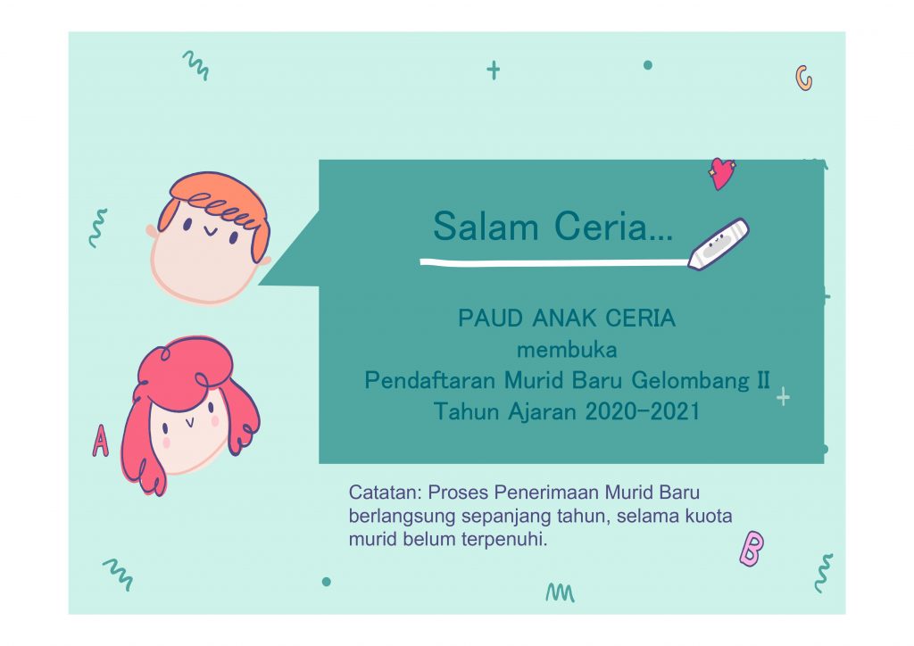 Penerimaan Murid Baru Tahun Ajaran 2020-2021 Gelombang IIby September 13, 2020December 7, 2020 Untuk informasi lebih lanjut dapat mengunduh file berikut ini: INFORMASI-PMB-PAUD-ANAK-CERIA-GELOMBANG-IIDownload FORMULIR-PMB-PAUD-ANAK-CERIA-GEL.IIDownload Related posts: Penerimaan Murid Baru Tahun Ajaran 2020-2021 INFORMASI PENERIMAAN MURID BARU (PMB) PENERIMAAN MURID BARU TAHUN AJARAN 2022-2023